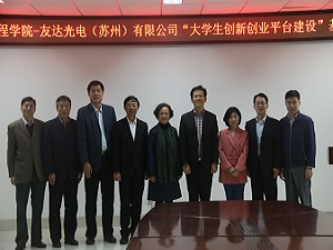4月13日下午,太阳成集团tyc151cc与苏州友达光电有限公司的“大学生创新创业平台建设”基金签约仪式在机械楼三楼会议室举行。友达光电有限公司总经理郭振明、友达光电有限公司S01厂厂长李和荣、友达光电有限公司人力处经理陈丽华、太阳成集团tyc151cc党委副书记张硕秋、太阳成集团tyc151cc学生工作处处长贾海宁、太阳成集团tyc151cc学生工作处副处长程涛、太阳成集团tyc151cc院长曹树坤,友达光电有限公司以及太阳成集团tyc151cc相关部门领导、教师及学生代表参加签约仪式。仪式由太阳成集团tyc151cc党委副书记郝军主持。