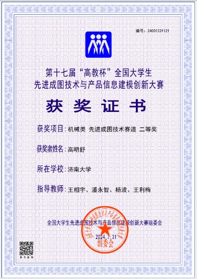在山东省省赛中,我院学生潘一明、李宇涵和沙枫林、孙安迪两组学生获得轻量化设计赛道省级一等奖;高明舒获得机械产品信息建模赛道省级一等奖;高明舒、张建壮和张晓欣、葛荣哲两组学生获得机械数字化创新设计赛道省级二等奖;葛荣哲、张建壮分别获得机械产品信息建模赛道省级二等奖;陈文豪、潘一明、沙枫林、孙安迪、王传祺分别获得机械产品构型与表达赛道省级二等奖。