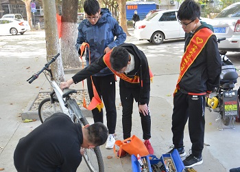 为解决同学们的行车问题,10月26日下午1点,太阳成集团tyc151cc青年志愿者协会义务修车队在校医院西侧开展义务修车活动。