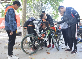 活动准备阶段,干事们便表现出极高的积极性和工作热情,他们忙着摆放修车工具,悬挂宣传横幅,准备活动在修车队长的带领下如火如荼的进行着。队员们不辞劳苦的忙里忙外,我们知道,这一届的义务修车队注入了一批干劲十足的新鲜血液。活动初始,修车队便收到一位同学的求助,其山地车碟刹出现故障,无法正常骑行。修车队员简单了解山地车的情况后,各司其职,开始修理,很快便完成了修理任务。车主高兴地道谢后,骑着车满意而去。接完这"第一单",干事们脸上都有着掩饰不住的自豪和喜悦,他们兴奋地分享着自己的心得体会。在没有同学求助时候,队长把队员们召集在一起,传授各种修车工具的用途、修车技巧以及修车注意事项,并拿自己的山地车来做教学示范。队长耐心地讲解,并不时地在山地车上敲敲打打,队员们不时地提出问题,一场特殊的"修车研讨会"火热的开展着,引行人纷纷瞩目。随后,修车队陆续接到同学求助,队员们解决不了的问题,队长便出马,借机会让队员们增长知识,提高修车能力,在帮助他人的同时,修车队干事们的能力也在一步步提升。赠人玫瑰,手留余香。队员们帮助他人后脸上掩饰不住的笑容,向我们证明了:这届义务修车队,一定更加优秀。