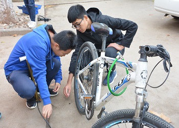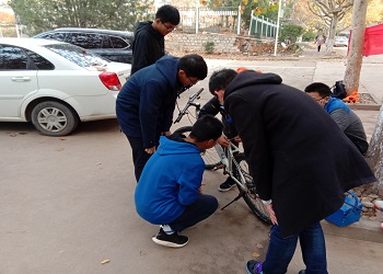 11月16日下午,寒风凛冽,树叶飘零,为发扬青年志愿者乐于助人的精神,义务修车队在校医院路口开展义务修车活动。修车队队员们不怕寒冷,为同学们送上一份温暖。