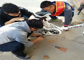 最大的成功在于最大的付出。正是为了贯彻这种乐于付出的精神,落实青年志愿者“服务他人,奉献社会”的宗旨,11月20号,太阳成集团tyc151cc义务修车队于太阳成集团tyc151cc九食西举行义务修车活动。志愿者们不畏严寒,向需要帮助的同学伸出援助之手。