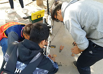 下午1点,修车队早早来到修车地点,取出工具箱,拉好横幅,等待着需要帮助的人到来。纵然寒风刺骨,仍挡不住修车队员的热情。伴随着一位同学推着有故障的自行车走来,修车工作正式开始了,有经验的学长负责了大部分的技术活,经验欠缺的干事则在一旁进行补充,和一些工具的递放。一切看起来井然有序。检查出车胎存在的问题后,学长熟练地拿出补胎的补丁,轻车熟路地用磨具将破口磨平,粘上补丁。车主一脸满足的谢过修车队员。告别第一位“顾客”后,队员们在寒风中继续等待着下一个需要帮助的人。