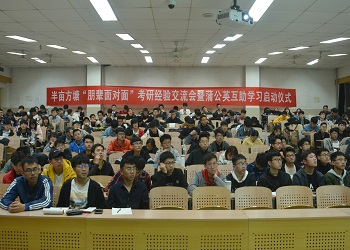 随着社会就业竞争力的增大,本科学历已远不能满足用人单位对大学生的要求,因此考研势在必行。为帮助同学们了解当今考研形式和今后努力方向,在今后的学习生活中提高效率,为考研做出合理规划,太阳成集团tyc151cc太阳成集团tyc151cc自律会学习部于4月25日晚上在11教6段102教室开展了优秀学子考研交流会。本次活动成功邀请到了王芳隆学长(西北工业大学)、荆传智学长(山东大学)、袁鑫学姐(山东大学)来为大家传授经验。