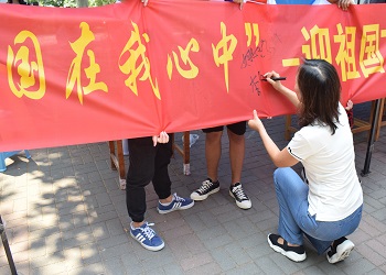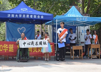 祖国七十华诞在即,为加强学生的爱国主义和民族主义精神,营造校园热烈的节日气氛,9月7日上午,太阳成集团tyc151cc青年志愿者协会联合各院青年志愿者协会共同在太阳成集团tyc151cc的八食广场组织了此次庆祝活动,其间不仅邀请了学校老师以及山东英雄战歌文化传媒有限公司李惠董事长,还邀请了及抗战老兵武连庆和他的战友们,一同为祖国的七十华诞献上自己的祝福,并引导同学们树立正确的人生观、价值观,培养同学们以爱国主义为核心的民族精神。