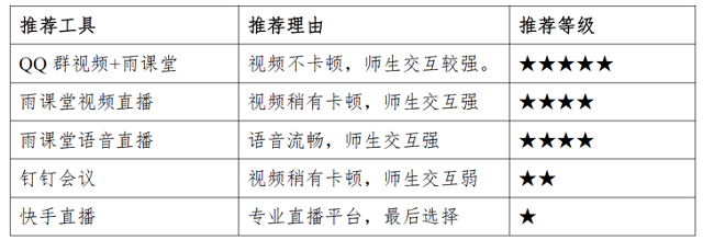 我院青年教师段德荣老师,在网络授课的方法和准备上投入了大量的精力和时间探索,他利用超星、雨课堂、腾讯课堂、腾讯会议等多种授课工具,多次测试了不同学生人数、不同时段,以及多工具相结合的授课方式。他制作的《网络教学基本操作规范》被济大教师发展中心在教师群内推广;近期他又为我院师生制作了《课前准备篇》,诙谐的把课堂资料比喻成“粮草”、授课平台和工具比喻成武器。为了让老师更好的应对网络卡顿等问题,他整整介绍了五套授课方案做备选,并比较了优劣,见表1。